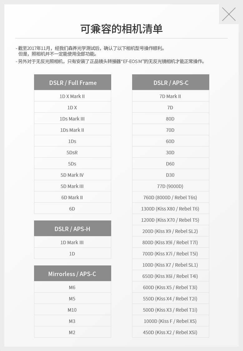 光學結構: 10組15片 (2片非球面鏡片、1片超低色散鏡片、3片高折射鏡片)