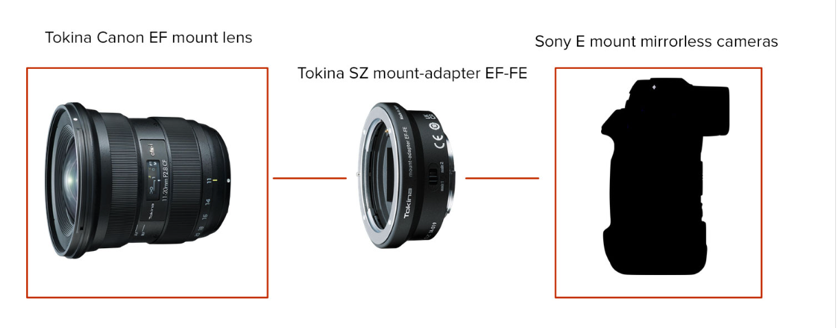 Tokina SZ 鏡頭適配器 EF-FE 旨在讓使用 Tokina 佳能 EF 鏡頭嘅攝影師同攝像師可以喺 Sony E 接環無反相機上使用。