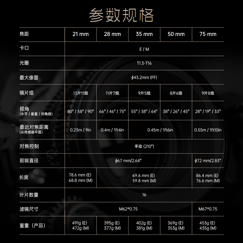 全系列對焦環與跟焦環均採用 0.8MOD標準尺距,適配常見跟焦器與影視配件,同齒位設計確保更換鏡頭與配件十無需重新調整。除 75mm鏡身,其他焦段鏡身長度均為 6.96cm,相近的長度與重量能夠在更換鏡頭時保持一致的操作手感,搭配穩定器或滑軌時能減少校正平衡的時間,提升拍攝效率。